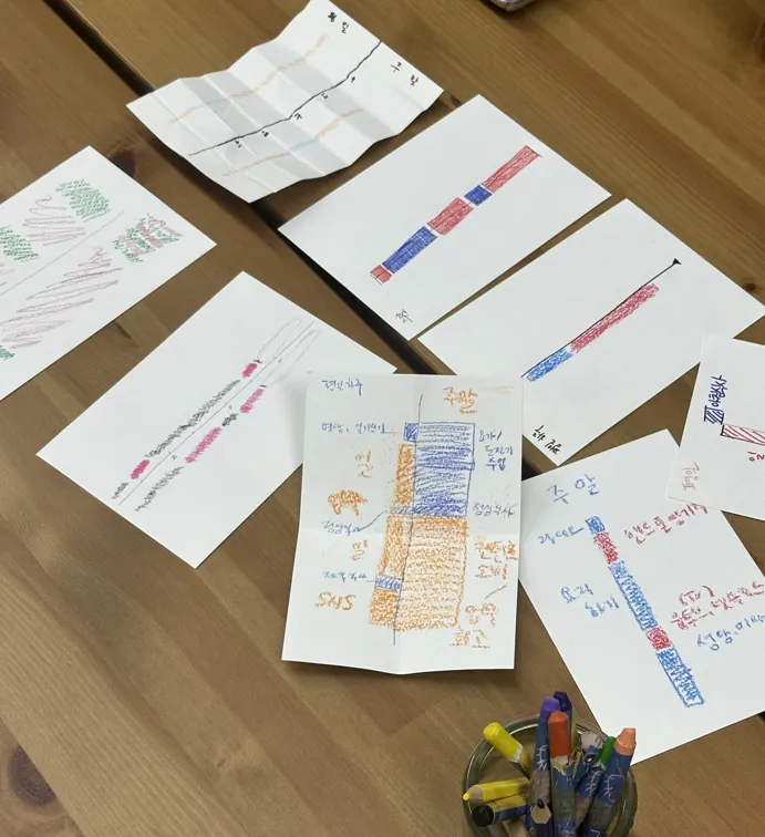 - 혜승: “같은 질문인데 경험하신 게 다르고 생각도 다르셔서 제 생각이 확장되는 느낌을 받았어요. 그리고 나름 뭐 아침에 딴짓도 안 하고 산다고 생각했는데, 막상 그려보니까 도자기와 요가를 제외하면 나머지는 다 빨간색이라… 돌아보게 될 것 같아요.”