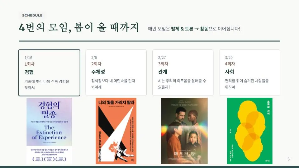 - 4회차로 구성, ‘경험’, ‘주체성’, ‘관계’, ‘사회’를 주제로 4번의 이야기